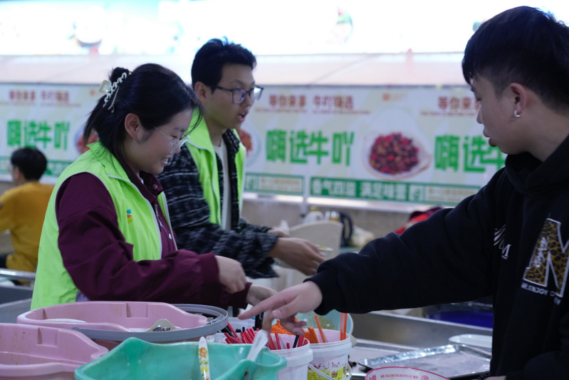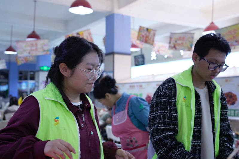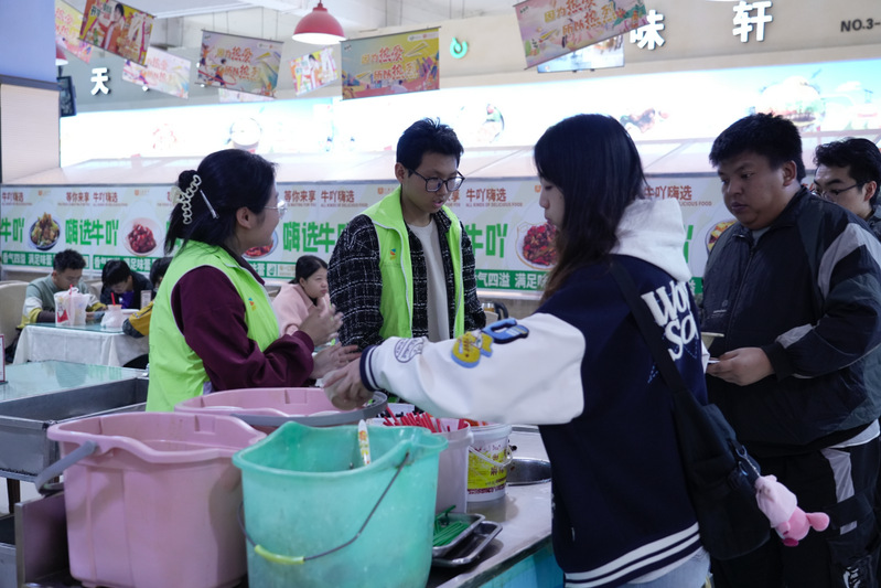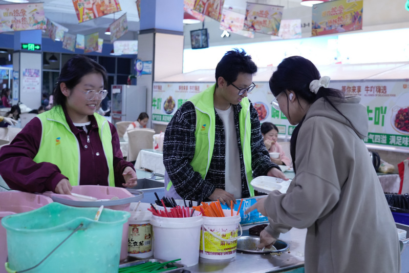 到了每日用餐时间,所有志愿者准时就位。一部分志愿者在餐具回收区整理同学们的餐盘,将剩余的食物倒入垃圾桶,并将推车内的餐具摆放的整齐有序;另一部分志愿者则在食堂入口处为同学们指引方向、推荐美味佳肴。