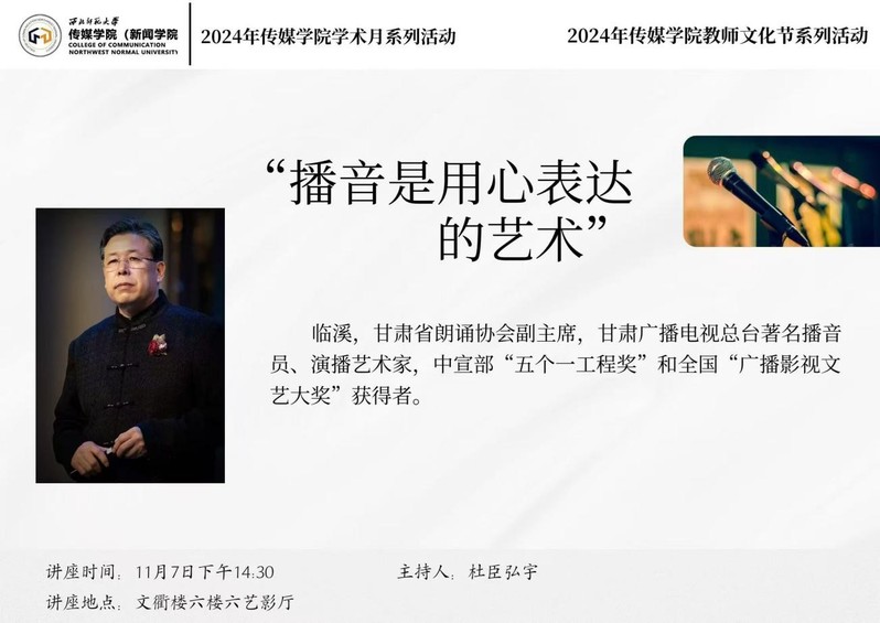 2024年11月7日下午2:30,甘肃省朗诵协会副主席临溪应邀公司师生开展了题为《播音是用心表达的艺术》的讲座。此次讲座由杜臣弘宇老师主持,gg999策略手机白菜2024级研究生聆听了此次讲座并进行了深入的交流。