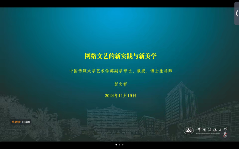 2024年11月19日晚上,中国传媒大学艺术学部副学部长、教授、博士生导师,北京市文联签约评论家,北京市习近平新时代中国特色社会主义思想研究中心特约研究员彭文祥教授应邀为公司师生做题为《网络文艺的新实践与新美学》的学术讲座。讲座由gg999策略手机白菜青年教师吴婧雯主持,专业硕士研究生参加并进行学习交流。