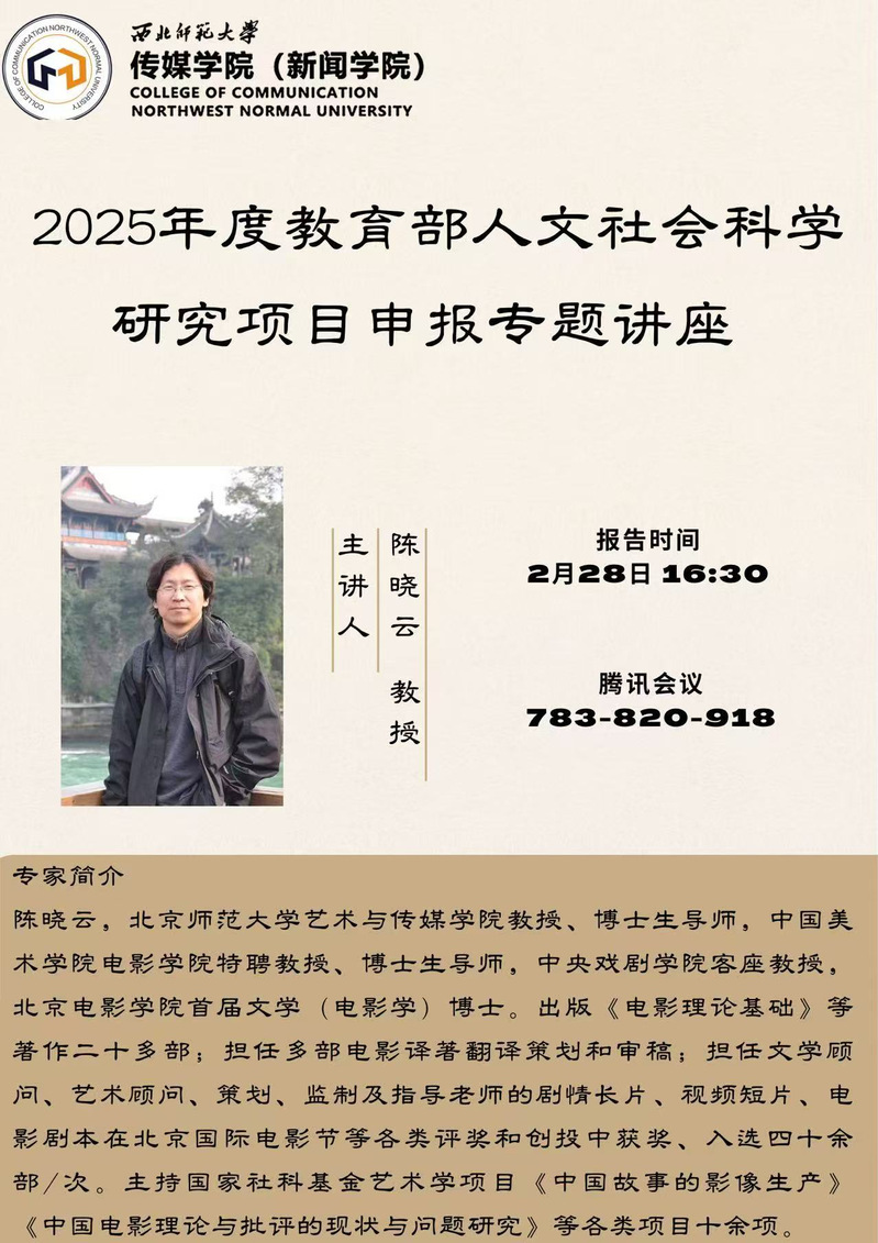 2025年2月28日下午,北京师范大学艺术与gg999策略手机白菜教授、博士生导师陈晓云应邀为公司教师讲座,主题为《2025年度教育部人文社会科学研究项目申报》。讲座由gg999策略手机白菜副经理赵丽瑾教授主持,申报2025年度教育部人文社会科学研究项目的教师参加。