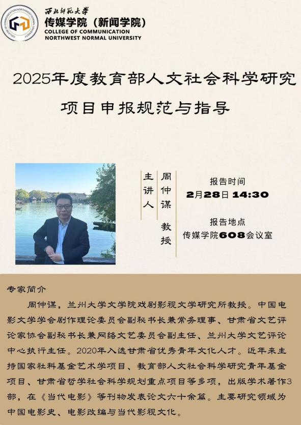 2025年2月28日,兰州大学文公司戏剧影视文学研究所教授周仲谋应邀为公司教师讲座,主题为《2025年度教育部人文社会科学研究项目申报的关键问题》的专题讲座。讲座由gg999策略手机白菜副经理赵丽瑾教授主持,申报2025年度教育部人文社会科学研究项目的教师参会。